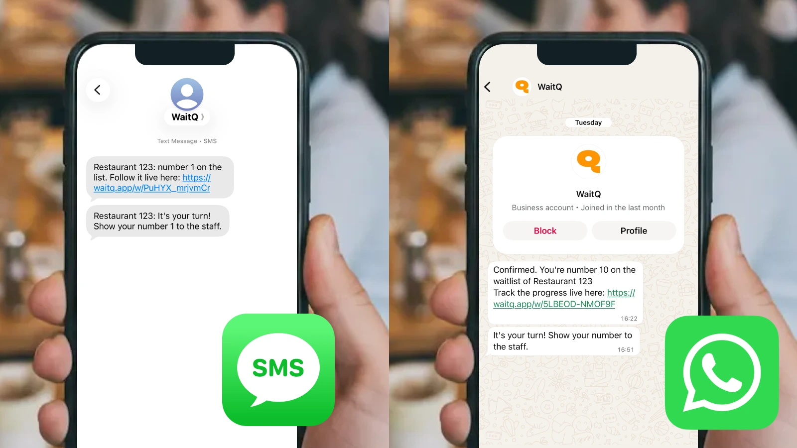 WaitQ supports SMS and WhatsApp notifications across 60+ countries. Email is available everywhere.